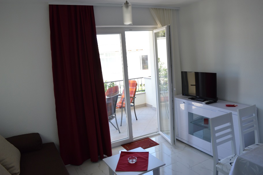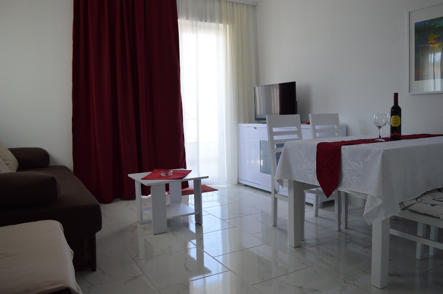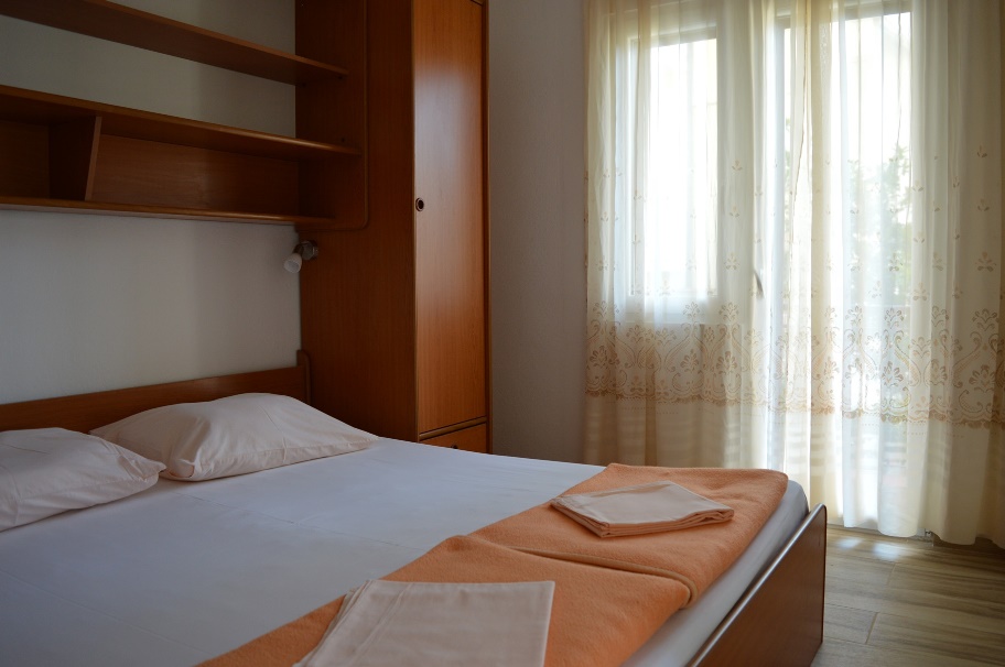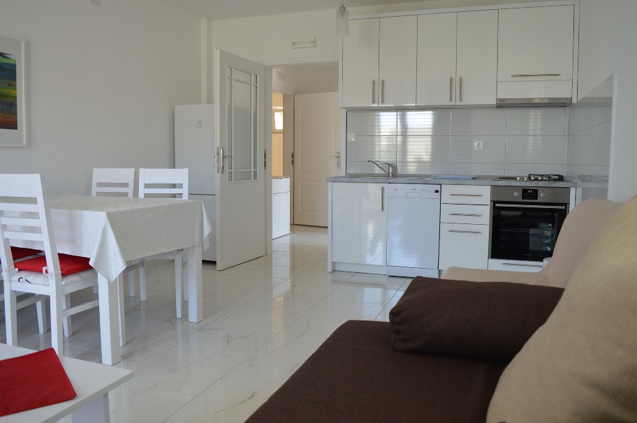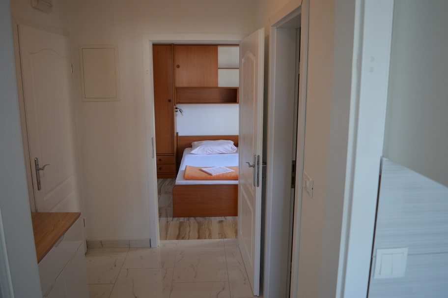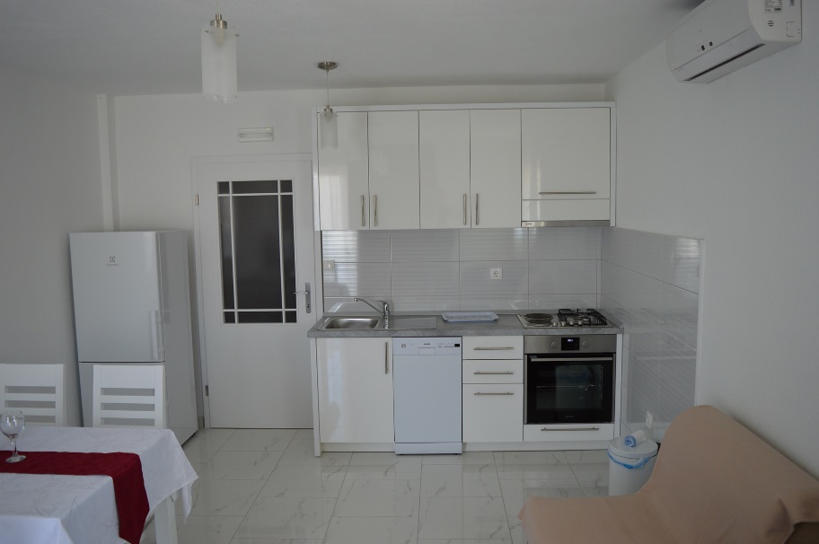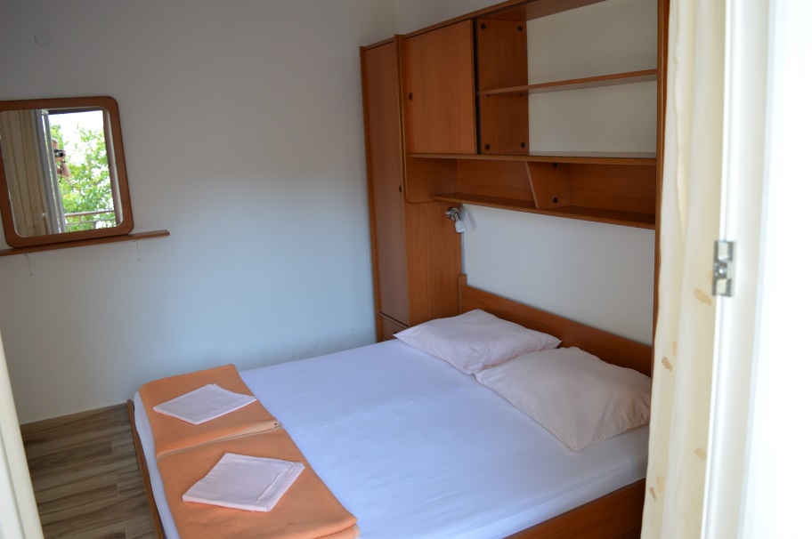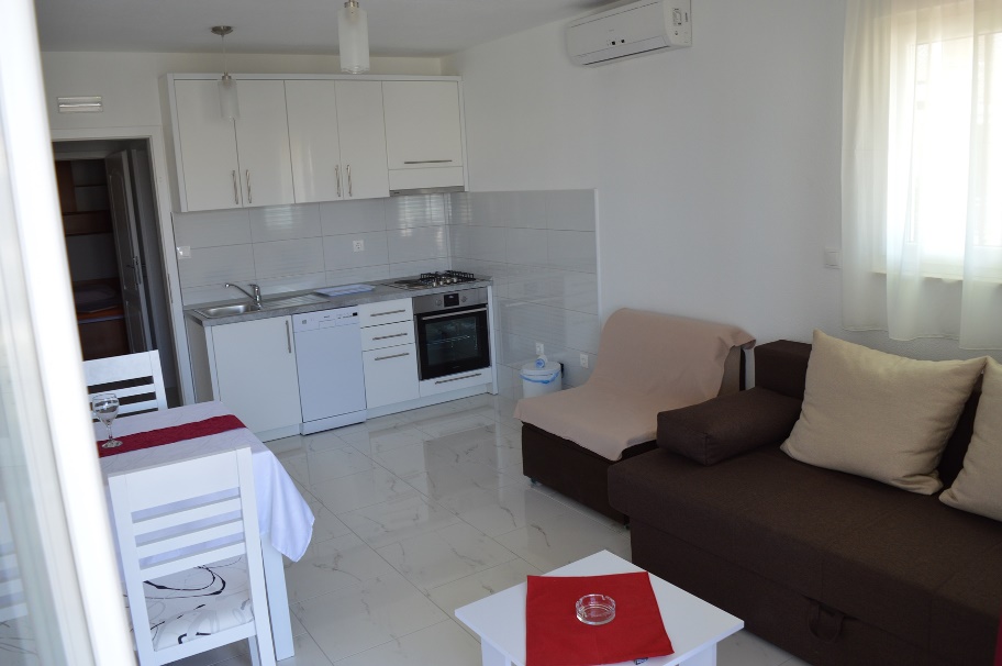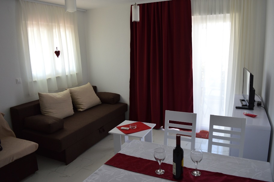 The second slideshow shows the pictures of the small apartment, which can accept 2+2 person. It is our newest apartment and it offers everything you need for your summer vacation. It has one room with big bed and its own balcony, elegant bathroom, fully equiped kitchen with with washing machine, big living room with a couch that can be extended and can serve as bed for 2 more people, and finally with big balcony with seaview where you can sunbathe or enjoy in evenings. The apartment is airconditioned, has a satallite tv and wifi connection which is free for your usage.